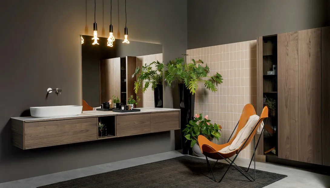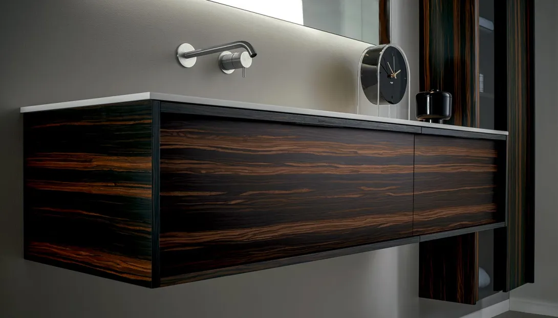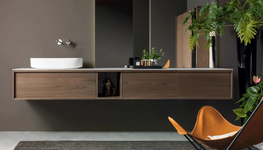 Langer, freischwebender Waschtisch aus dunklem Holz mit rundem Spiegel und minimalistischer Armatur in modernem Badezimmer von Stocco.