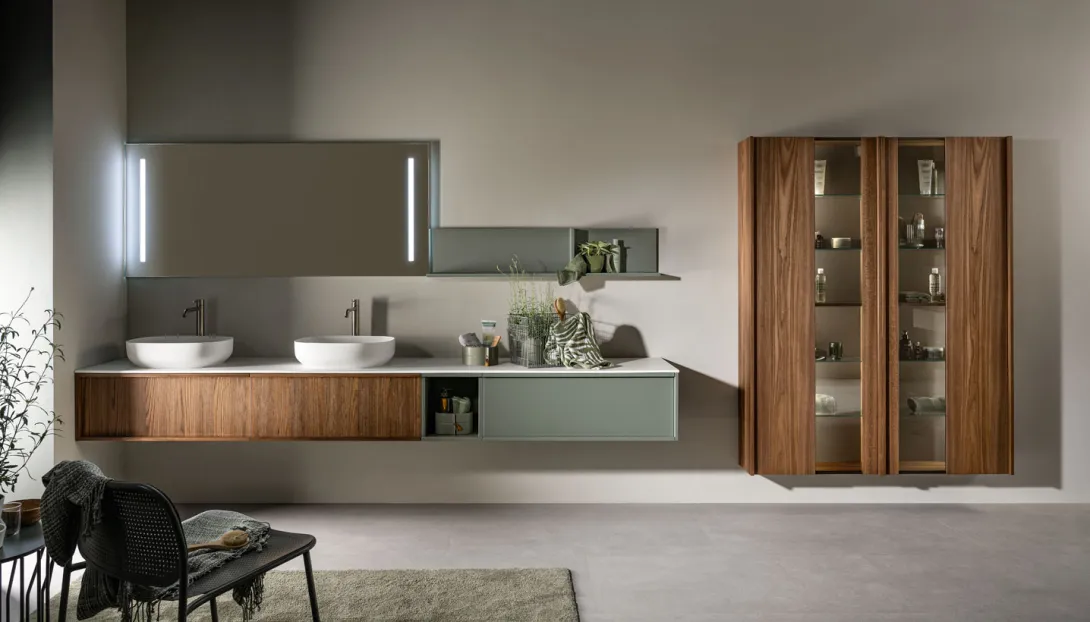 Helles Badezimmer von Stocco mit grünem Doppelwaschtisch, offenen Regalfächern, ovalen Spiegeln und begehbarer Dusche.