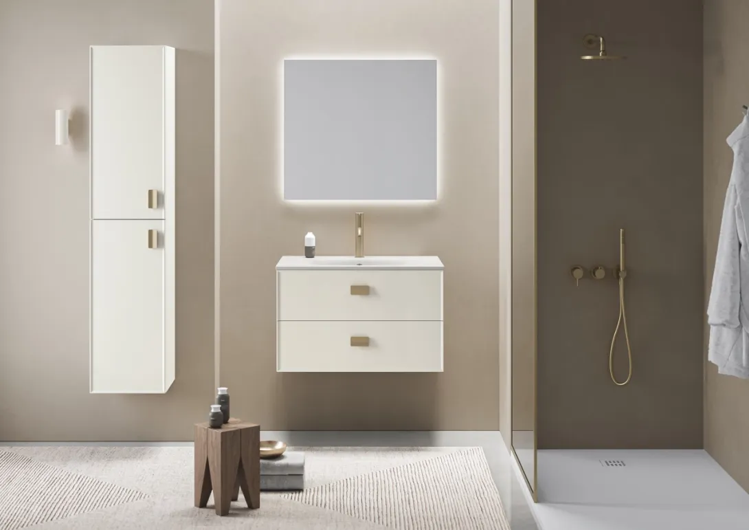 Wandhängendes Badmöbel in Beige mit Chromgriffen, beleuchtetem Spiegel und bodengleicher Dusche.